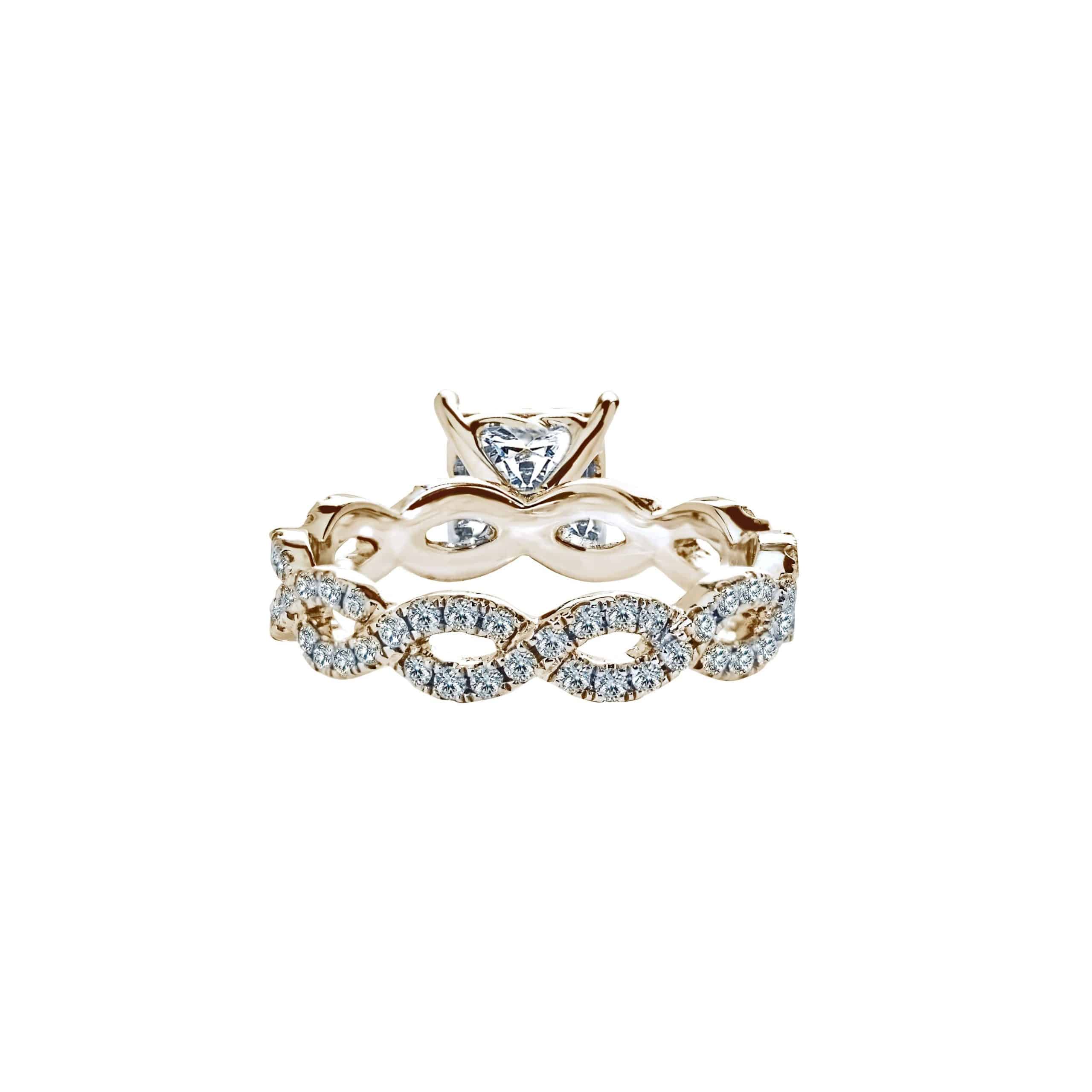 This stunning princess cut halo eternity ring is formed by two bands of micropavé set diamonds intertwined around one another for an elegant look together with a crown of halo dazzled with a center princess cut sapphire that will seal your love.