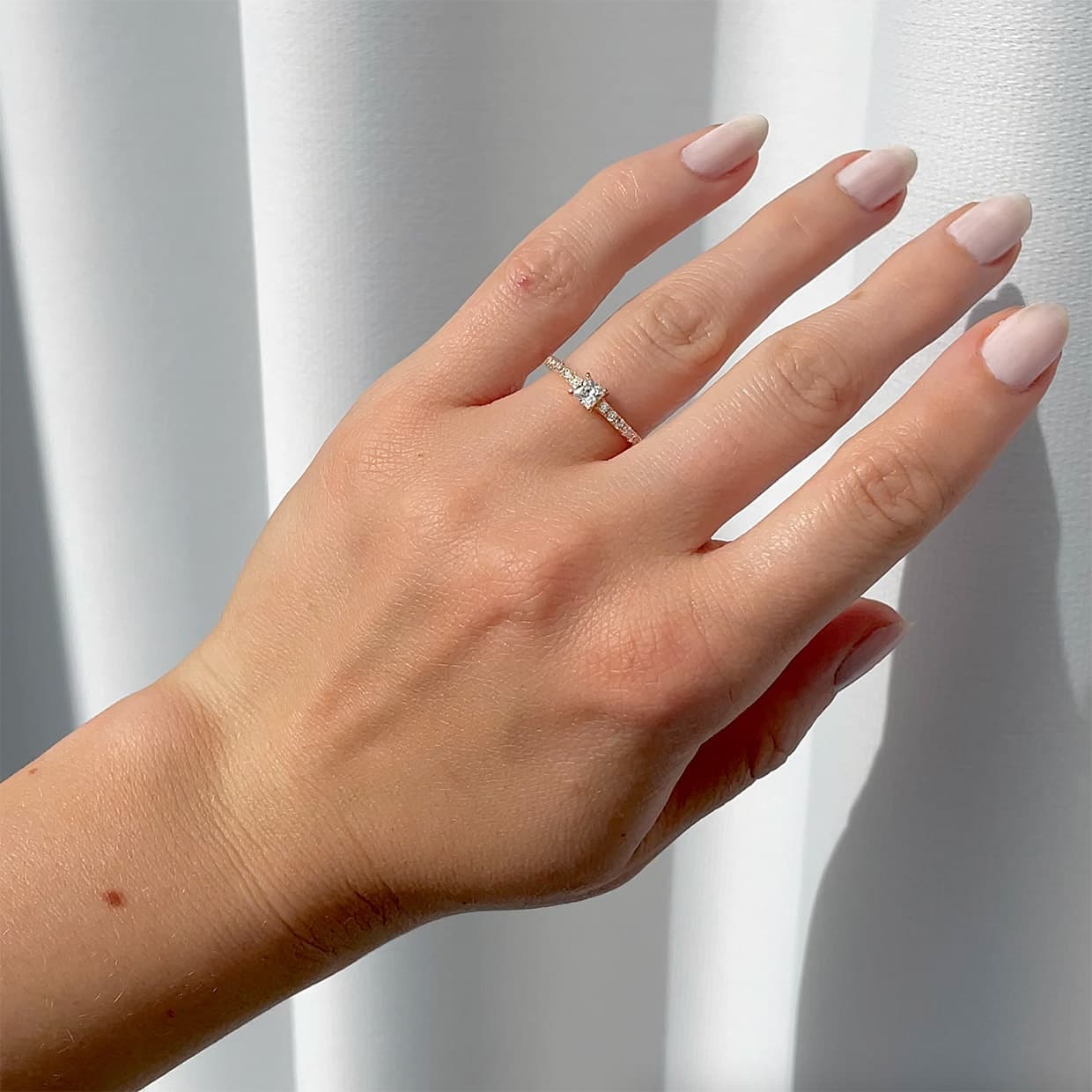 Celebrate your love story with our stunning solitaire engagement ring, featuring a captivating princess-cut diamond and delicate smaller diamonds down the band, now available in classic gold. Crafted with the finest materials and attention to detail, this ring sparkles with timeless elegance and sophistication. The center stone’s unmatched brilliance captures the essence of your love, while the smaller diamonds add an extra layer of charm and brilliance. A perfect choice for those who want a ring that’s both simple and stunning, this ring will be treasured for a lifetime.