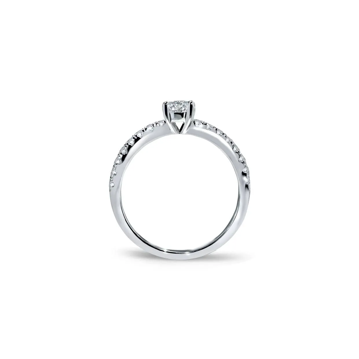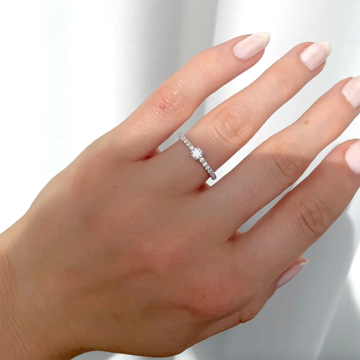 Elevate your love story with our stunning solitaire engagement ring, featuring a captivating round-cut diamond and delicate smaller diamonds down the band, now available in classic white gold. Expertly crafted with the finest materials, this ring sparkles with unmatched brilliance and sophistication. The center stone’s radiant beauty is perfectly complemented by the smaller diamonds, adding an extra layer of charm and elegance.