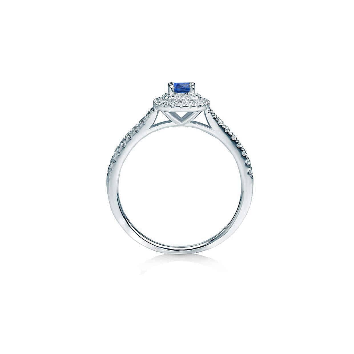 Sparkly diamonds surround an intensely blue-colored sapphire. Ring in 10, 14, or 18 karat white gold with a cushion-cut sapphire and a double halo of round brilliant diamonds.