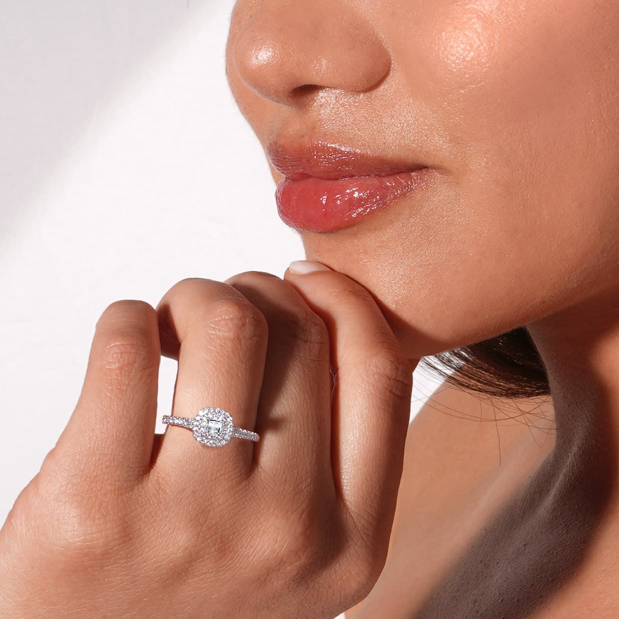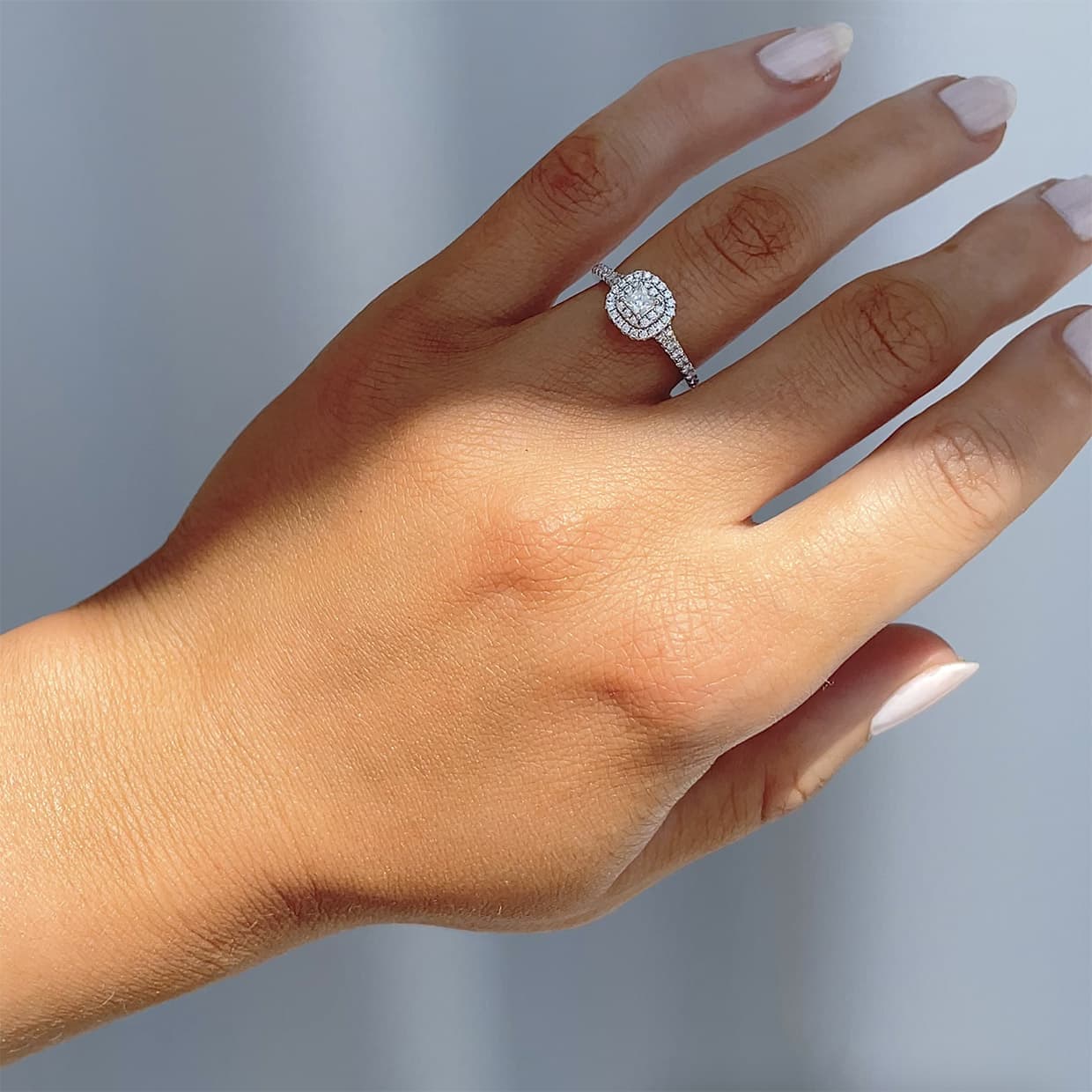 Sparkly diamonds surround an intensely white sapphire. Ring in 10, 14 or 18 karat white gold with a princess cut sapphire and a double halo of round brilliant diamonds.