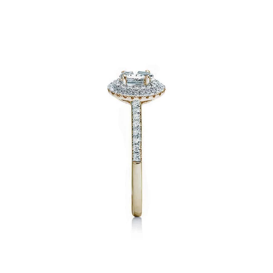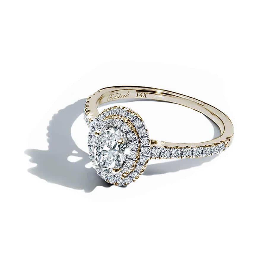 Sparkly diamonds surround an intensely white sapphire. Ring in 10, 14 or 18 karat gold with an oval sapphire and a double halo of round brilliant diamonds.
