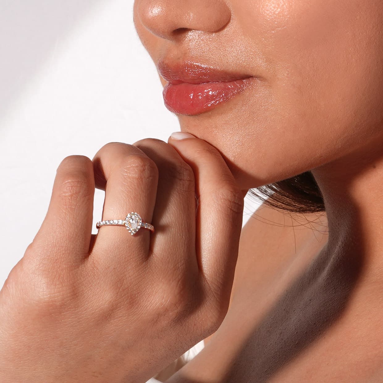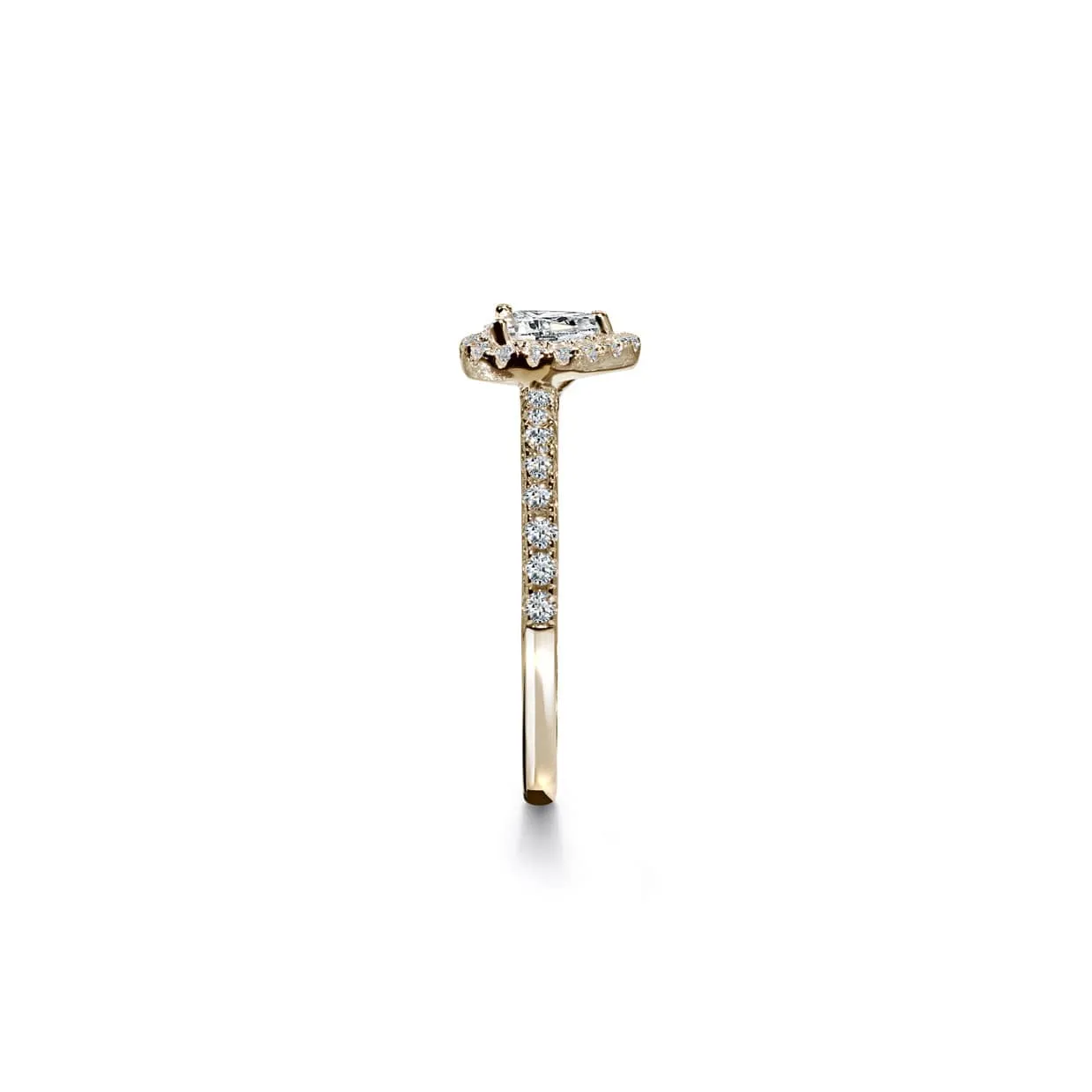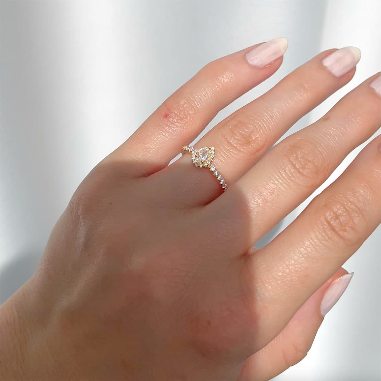 Experience the epitome of luxury and sophistication with our stunning pear-cut diamond engagement ring, featuring a dazzling diamond halo and delicate diamonds down the band, now available in classic gold. Expertly crafted with the finest materials, this ring exudes unparalleled brilliance and beauty. The center stone’s unique and alluring shape is perfectly complemented by the exquisite halo and the delicate diamonds adorning the band, adding an extra layer of charm and elegance.