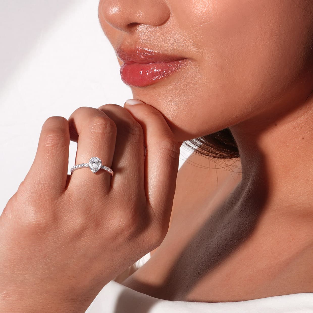 Experience the epitome of luxury and sophistication with our stunning pear-cut diamond engagement ring, featuring a dazzling diamond halo and delicate diamonds down the band, now available in classic white gold. Expertly crafted with the finest materials, this ring exudes unparalleled brilliance and beauty. The center stone’s unique and alluring shape is perfectly complemented by the exquisite halo and the delicate diamonds adorning the band, adding an extra layer of charm and elegance.