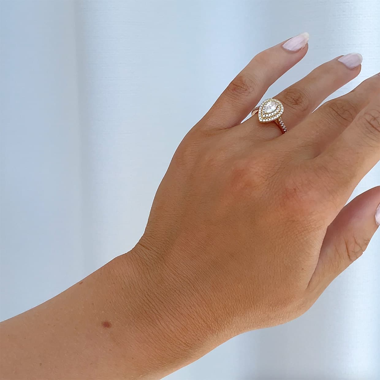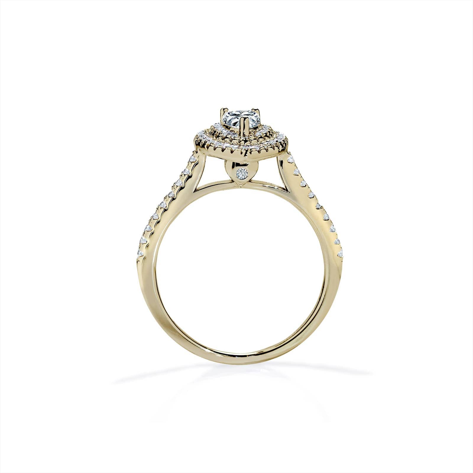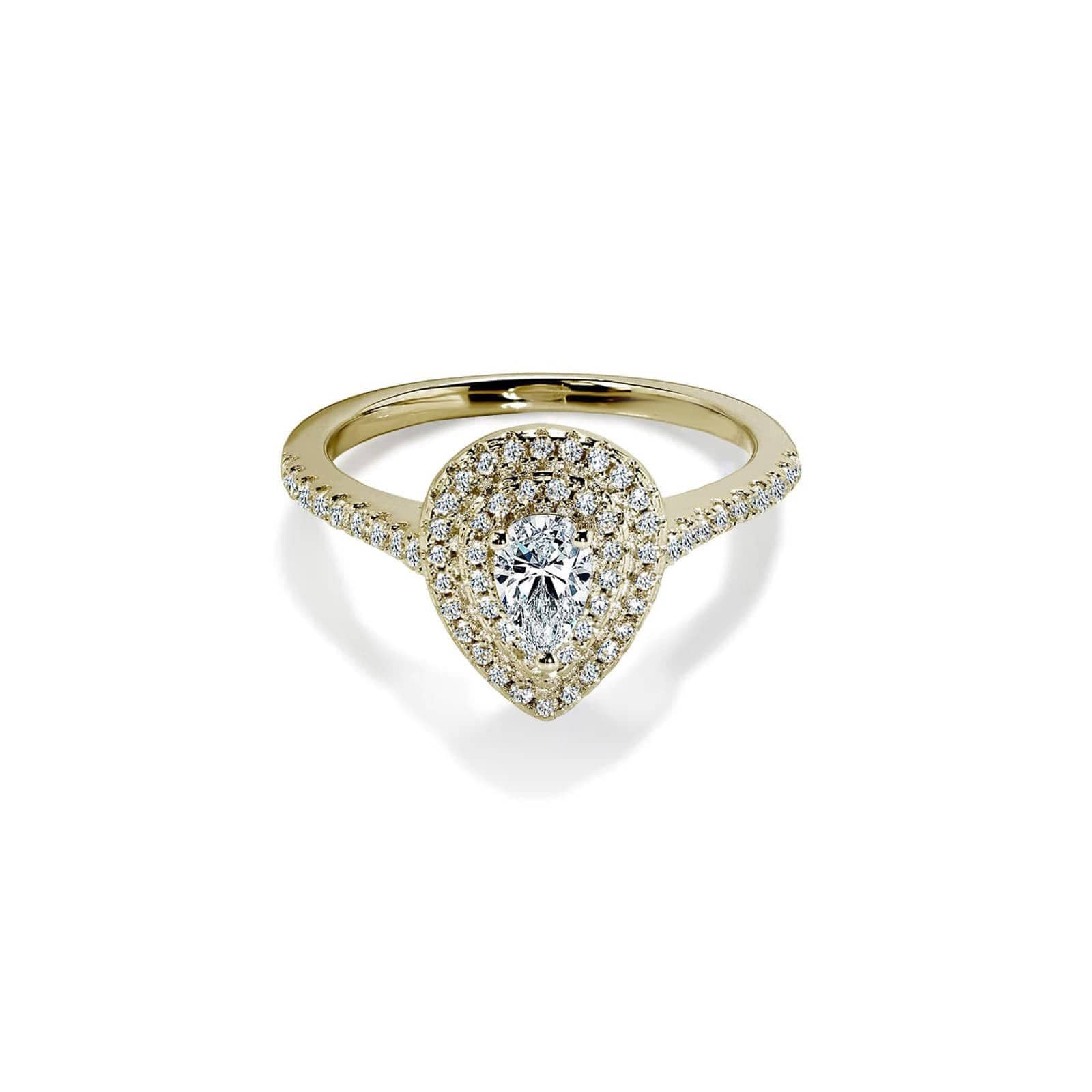 Sparkly diamonds surround an intensely white sapphire. Ring in 10, 14 or 18 karat gold with a pear cut sapphire and a double halo of round brilliant diamonds.