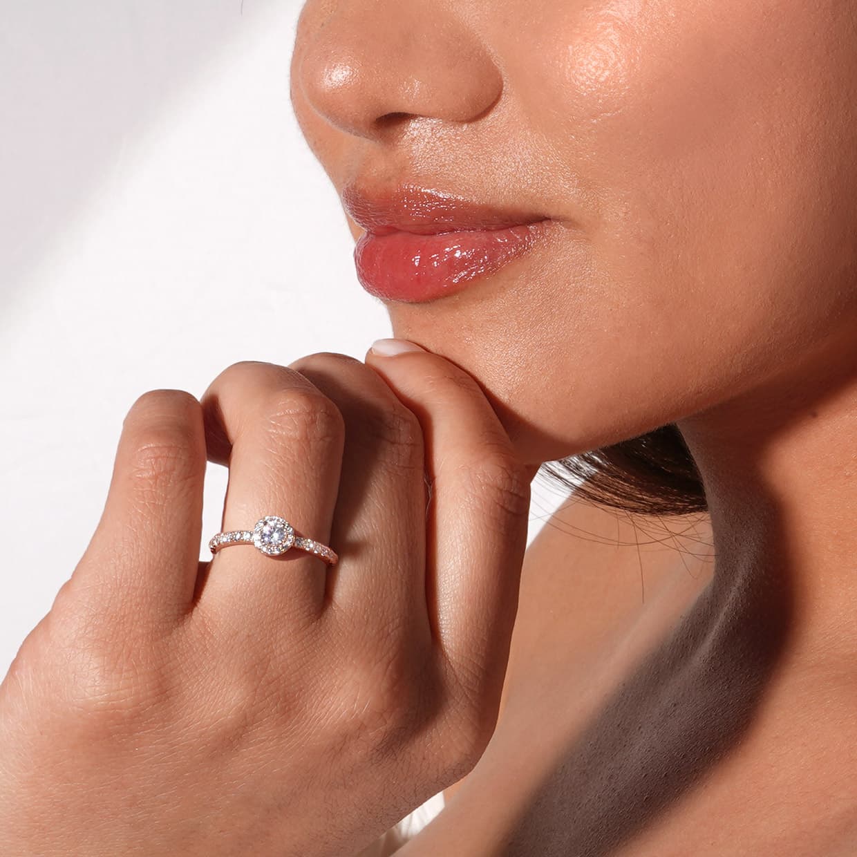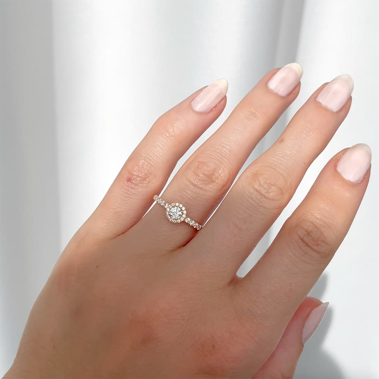 Elevate your love story with our stunning round-cut diamond engagement ring, featuring a captivating diamond halo and delicate diamonds down the band, now available in classic gold. Expertly crafted with the finest materials, this ring sparkles with unmatched brilliance and sophistication.