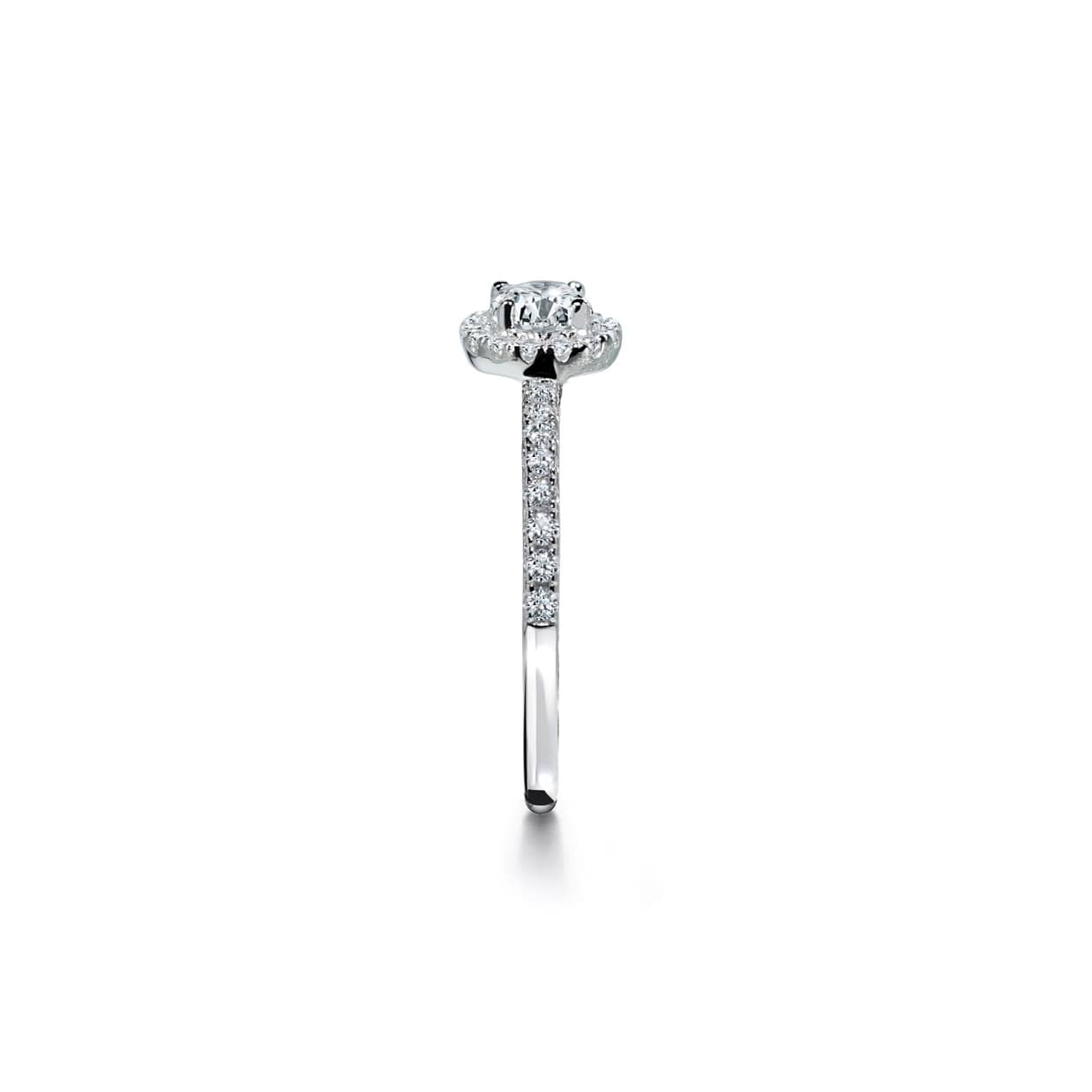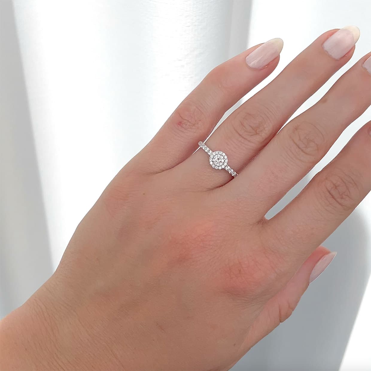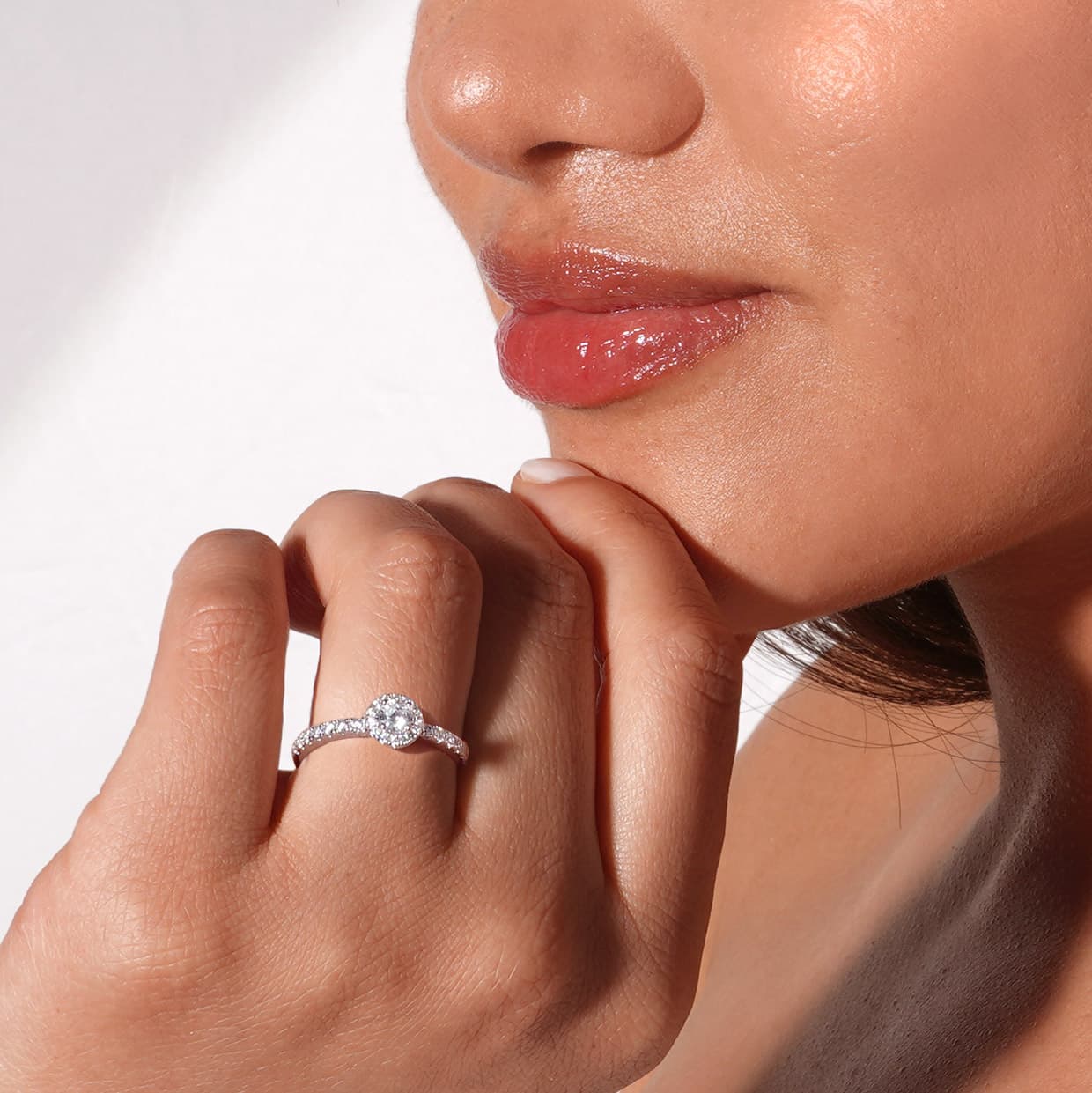 Elevate your love story with our stunning round-cut diamond engagement ring, featuring a captivating diamond halo and delicate diamonds down the band, now available in classic white gold. Expertly crafted with the finest materials, this ring sparkles with unmatched brilliance and sophistication.