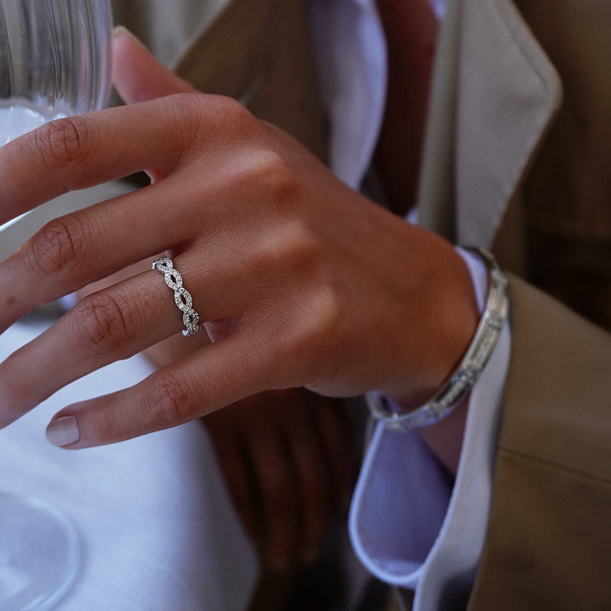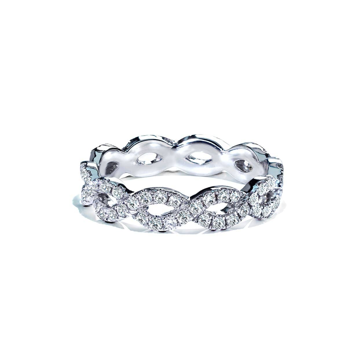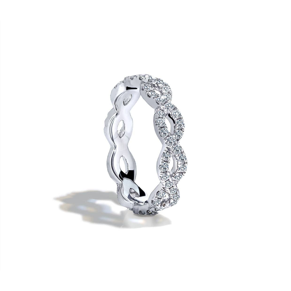 This stunning and delicate wedding Eternity ring is formed by two bands of micropavé set diamonds intertwined around one another for an elegant look. Diamonds are twirling all around the finger.